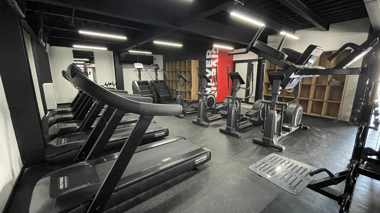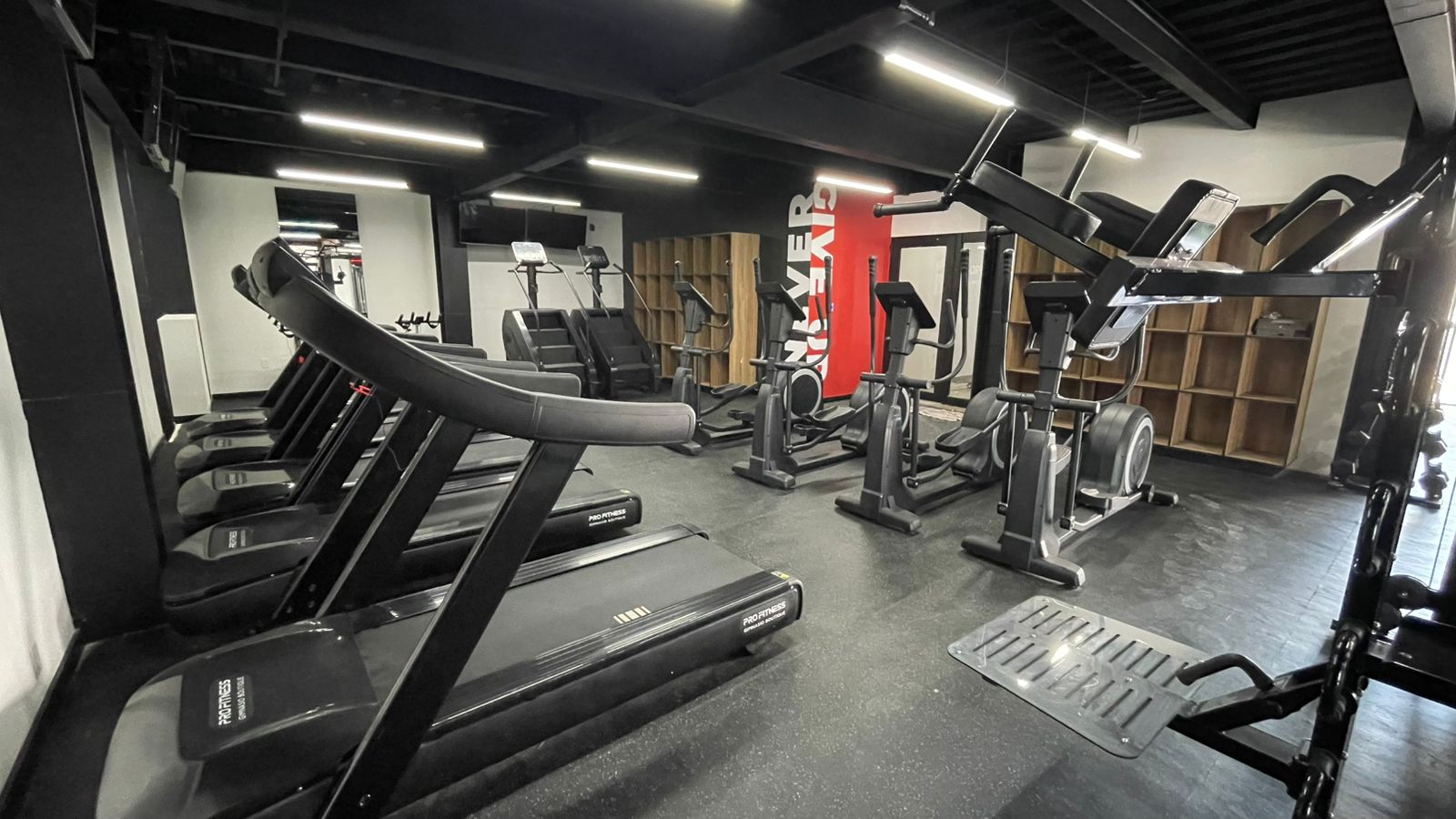 Equipos de última generación, área de pesas libres y máquinas cardiovasculares con pantallas individuales.